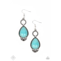 A silver ring decorated in a rustic dot motif anchors a turquoise stone teardrop, creating a swaying pendant. The stone is encased in a textured frame that features a flared bottom edge with airy scalloped cutouts. Earring attaches to a standard fishhook fitting. As the stone elements in this piece are natural, some color variation is normal.