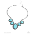 Two antiqued silver bars curl around the neck as they give way to a row of refreshing turquoise stones that falls delicately below the collar. Each stone is encased in a textured silver frame, adding a traditional artisanal flair to each unique pendant. Features an adjustable clasp closure.