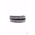 Infused with dainty gunmetal ball chain, glittery hematite rhinestones are sprinkled across a black suede band in a cube like pattern for an edgy look. The elongated band allows for a trendy double wrap design. Features an adjustable snap closure.