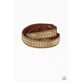 Infused with dainty brass ball chain, glittery aurum rhinestones are sprinkled across a brown suede band in a cube like pattern for an edgy look. The elongated band allows for a trendy double wrap design. Features an adjustable snap closure.