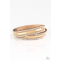 Rows of classic gold chain, flat gold chain, and dainty white rhinestones are encrusted along a suede band dusted in golden sparkles for a sassy look. The elongated band allows for a trendy double wrap design. Features an adjustable snap closure.