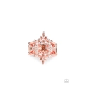Dotted in glassy peach rhinestones, dainty shiny copper bands and flirty heart-shaped shiny copper frames weave around a timeless peach rhinestone center, creating a regally layered centerpiece atop the finger. Features a stretchy band for a flexible fit.