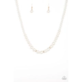 Gradually increasing in size near the center, a strand of luminescent white pearls falls just below the collar. White rhinestone encrusted rings are sprinkled along the center for a timeless finish. Features an adjustable clasp closure.
