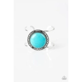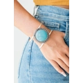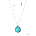 A refreshing turquoise stone is pressed into the center of a shimmery silver frame radiating with sunburst details. The earthy frame swings from the bottom of a lengthened silver chain for a seasonal finish. Features an adjustable clasp closure.