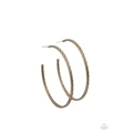 Etched in a subtle slanted texture, a dainty brass hoop delicately curves around the ear in a rustic finish. Earring attaches to a standard post fitting. Hoop measures approximately 2” in diameter.