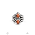 Two back-to-back Cinnamon Stick teardrop beads sit atop a stacked band of silver filigree, creating a whimsical centerpiece atop the finger. Features a stretchy band for a flexible fit.