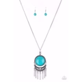 Swinging from the bottom of a lengthened silver chain, a dramatic turquoise stone gives way to an ornate crescent shaped frame dotted with a dainty white stone. Brushed in an antiqued shimmer, flared silver bars swing from the bottom of the dramatic pendant, adding a playful movement to the seasonal palette. Features an adjustable clasp closure.