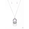 Swinging from the bottom of a lengthened silver chain, a dramatic gray stone gives way to an ornate crescent shaped frame dotted with a dainty gray stone. Brushed in an antiqued shimmer, flared silver bars swing from the bottom of the dramatic pendant, adding a playful movement to the seasonal palette. Features an adjustable clasp closure.