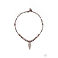 Infused with ornate copper beads, a hammered copper arrowhead pendant is knotted in place between a row of rustic copper rings below the collar for a seasonal look. Features a button loop closure.
