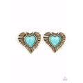 Etched in rustic texture, an antiqued brass frame gathers around a heart shaped turquoise stone center, creating a romantic display. Earring attaches to a standard post fitting.