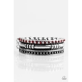 Dotted in tribal inspired textures, three glistening silver bars coalesce into a dainty band. Dainty red rhinestones are encrusted along the top of the band, adding a glittery finish to the indigenous look. Features a dainty stretchy band for a flexible fit.