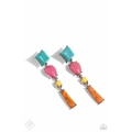 Featuring square, teardrop, round, and skinny rectangular cuts, marbled turquoise, pink, yellow, and brown stones are encased in pronged silver fittings as they delicately link into a colorfully earthy lure. Earring attaches to a standard post fitting. As the stone elements in this piece are natural, some color variation is normal.