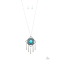 Radiating with studded details and refreshing turquoise stones, a round frame is nestled inside of an airy silver square for a tribal-inspired look. Attached to a lengthened silver chain, the colorful stone pendant gives way to rows of silver chain fringe for a statement-making finish. Features an adjustable clasp closure.