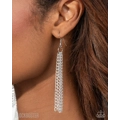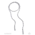 A lengthened strand of spiraling, interlocking abstract silver links, with light-catching texture, wraps around the neck, creating a layered choker-inspired necklace. Two tassels of classic silver chains cascade from both ends of the chain, adding dramatic length and versatility to the way the piece can be worn. Sold as one individual necklace. Includes one pair of matching earrings.