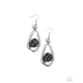 A faceted silver bead, pressed in an abstract hammered silver frame gives way to a sliding abstract elongated silver frame. Suspended along the lower curve of the frame, a black-spotted stone stands out below the ear for a trendy, timeless display. Earring attaches to a standard fishhook fitting. As the stone elements in this piece are natural, some color variation is normal. Sold as one pair of earrings.