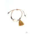 Infused with antiqued silver beads, a multicolored threaded tassel and dainty white seashell slides along strips of shiny brown cording around the wrist for a summery look. Features an adjustable sliding knot closure.