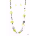 Infused with hammered silver discs, an assortment of green and white shell-like discs are knotted in place along a gray cord, creating a summery display across the chest. Features an adjustable clasp closure.