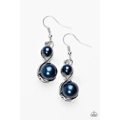A glistening ribbon of silver loops around two blue pearls, creating an elegant infinity. Earring attaches to a standard fishhook fitting.