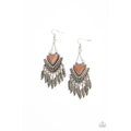 A triangular brown bead is pressed into the top of a spade shaped frame radiating with studded and embossed texture. Brushed in an antiqued shimmer, textured silver feathers dance from the bottom of the decorative silver frame for a free-spirited finish. Earring attaches to a standard fishhook fitting.