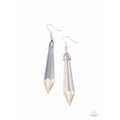 Featuring a stellar iridescent finish, a dramatically elongated white gem attaches to a silver fitting that swings from the ear for a hypnotizing fashion. Earring attaches to a standard fishhook fitting.