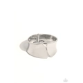 A thick band of high-sheen silver, with its edges seemingly sheared off, creates a sharp, edgy cuff-like bracelet around the wrist. Features a hinged closure.