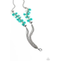 Flared between two oversized silver beads, a collection of turquoise and white shell-like beads give way to sections of silver chains that connect across the chest for a colorful summery look. A lobster clasp hangs from the bottom of the elongated design to allow a name badge or other item to be attached. Features an adjustable clasp closure.