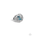 Dazzling rows of white rhinestones arc across the finger, creating a brilliant, layered effect. Set along the center of the ring, radiant rectangular gems in a blue hue add a vibrant touch to the silver backdrop. Features a stretchy band for a flexible fit.