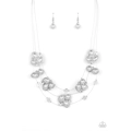 Strung along a trio of delicate silver wires, an ethereal collection of white crystal-like gems, clear faceted beads, and timeless pearls are pressed into teardrop, oval, and circular frames as they cluster along the collar. The mismatched clusters of sparkle and refinement seemingly float across the neckline, emitting an air of effortless elegance. Features an adjustable clasp closure.
