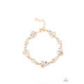 Encased in sleek gold frames, dainty pairs and trios of glittery white rhinestones delicately link into a timeless display around the wrist. Features an adjustable clasp closure.