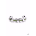 A row of Olive Branch seed beads is threaded along a wire inside a studded silver frame as it flows around a silver cuff. Flared antiqued silver accents embellish the edges of the cuff for a rustic finish.