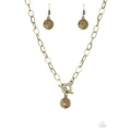 Encrusted in glittery aurum rhinestones, a dainty brass disc swings from the bottom of a glistening brass chain for a classic look. Features a toggle closure.