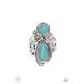 Whimsical feather and floral accents coalesce into antiqued silver frames that wrap around a pair of stacked round and teardrop turquoise stones. The ornate collection sits atop layered silver bands, creating an earthy rustic statement atop the finger. Features a stretchy band for a flexible fit.