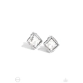 Shiny silver bars gently overlap with white rhinestone encrusted silver bars around a square cut white rhinestone, resulting in a refined radiance. Earring attaches to a standard clip-on fitting.