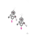 Infused with glittery Pink Peacock rhinestone and crystal-like accents, a whimsical display of silver heart, flower, and bird charms dance from the bottom of a decorative floral silver frame, creating a noisy fringe. Earring attaches to a standard fishhook fitting.