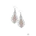 Dotted with glassy white rhinestones, elegant silver filigree curls around a brown pearl dotted center for a regal look. Earring attaches to a standard fishhook fitting.
