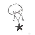Infused with silver beaded and studded oversized starfish accents, a lengthened strip of gray suede double wraps around the neck, creating a layered choker necklace. Two whimsical silver starfish charms swing from the ends as a silver bead slides up and down the suede strands, adjusting the length of the coastal piece.