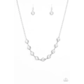Encased in studded silver frames, glittery white rhinestones link below the collar for a glamorous look. Features an adjustable clasp closure.