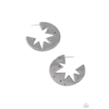 Sporadically dotted with various blue and blue iridescent rhinestones, a three-dimensional star outline explodes from the center of a polished silver disc for an out-of-this-world centerpiece. Earring attaches to a standard post fitting. Hoop measures approximately 1 3/4" in diameter. Due to its prismatic palette, color may vary.