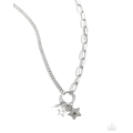 A strand of silver paperclip chain collides with a dainty curb chain to create an abstract blend of grit and glitz. Each chain connects to a silver ring that features a silver lightning bolt, white gem, white rhinestone-encrusted silver star, and white-painted star, creating a perfectly balanced stellar design. Features an adjustable clasp closure.