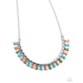 A dainty silver chain gives way to a collection of high-sheen silver round and rectangular beads that coalesce below the neckline. Pronged in emerald-cut, silver-pronged fittings, a collection of turquoise, Desert Flower, and Watercress stones cascade below the high-sheen silver beads for an elegantly earthy display. Features an adjustable clasp closure. As the stone elements in this piece are natural, some color variation is normal.