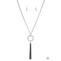 Encrusted in dazzling white rhinestones, a shimmery gunmetal hoop swings from the bottom of an elegantly elongated gunmetal chain for a refined look. A glistening gunmetal tassel swings from the bottom of the glittery pendant for a flirty flair. Features an adjustable clasp closure.
