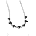 Suspended from two silver fittings, a shimmery cascade of dainty silver chains layer around the collar for an industrial statement. Infused amongst the industrial strands, a collection of pronged white gems alternate with pronged black triangular gems for a touch of gritty color. Features an adjustable clasp closure.