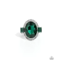 An oversized oval emerald gem is pressed into the center of a white rhinestone-encrusted silver frame atop emerald emerald-cut stacked silver bands, creating a glamorous centerpiece atop the finger. Features a small dainty stretchy band for a flexible fit.