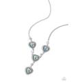 Pressed in a border of white rhinestones and silver studs, iridescent-brushed gray hearts delicately link below the collar in a charming, extended fashion. Solitaire white gems alternate between each heart frame for additional shimmer. Features an adjustable clasp closure. Due to its prismatic palette, color may vary.