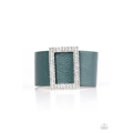 Two rows of dazzling white rhinestones coalesce into a rectangular frame. The glittery frame is threaded along a band of blue leather, creating a stunning centerpiece. Features an adjustable snap closure. Sold as one individual bracelet.