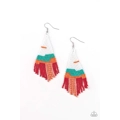 Strands of Biscay Green, Coral Pink, Orange Peel, red, and white seed beads colorfully weave into a vivaciously beaded fringe. Earring attaches to a standard fishhook fitting.