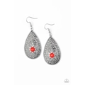 A fiery red stone bead is pressed into an ornate silver teardrop radiating with sunburst details for a seasonal look. Earring attaches to a standard fishhook fitting.