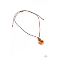 A ceramic orange hoop and brown bead is knotted in place along a shiny brown cord, creating an earthy pendant below the collar. Features an adjustable sliding knot closure.