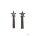A curtain of gunmetal chains streams out from the bottom of an oversized gunmetal star encrusted in smoky hematite rhinestones, resulting in a stellar tassel. Earring attaches to a standard post fitting.