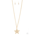 Blinding white rhinestones are encrusted across the front of an oversized gold star frame at the bottom of a lengthened gold chain, resulting in a stellar sparkle. Features an adjustable clasp closure.